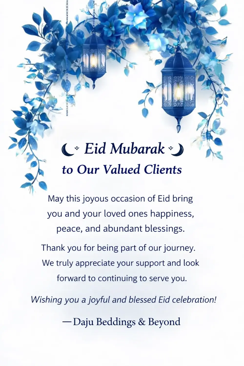 Eid al-Fitr Celebrations at Daju Beddings & Beyond Daju Beddings & Beyond proudly joins our Muslim clients and the wider community in celebrating the joyous occasion of Eid al-Fitr, marking the end of the holy month of Ramadan. |